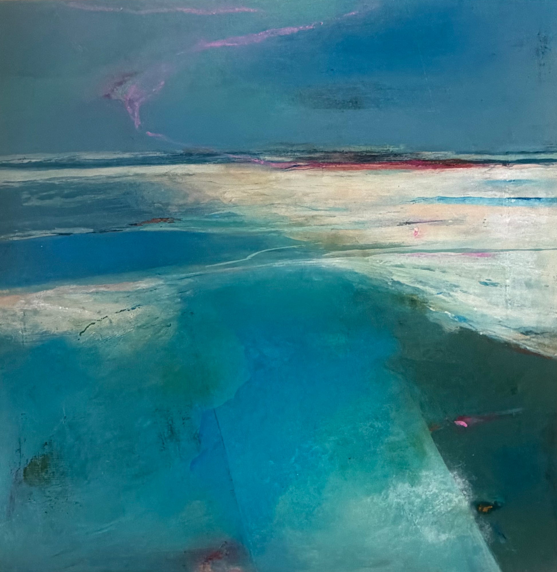 Medium: Acrylic and Mixed Media on panel in natural wood frame