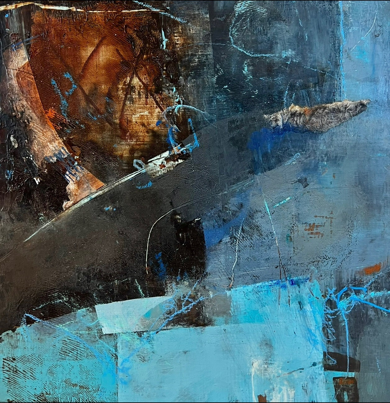 Medium: Acrylic and Mixed Media on panel in natural wood frame